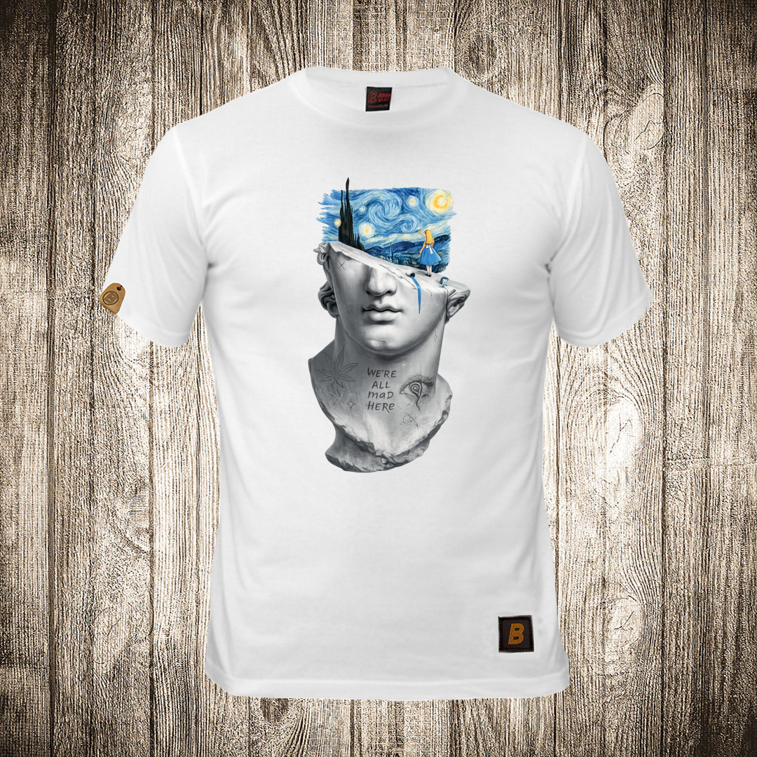 muska majica boja bela slika alisa u zemlji cuda statua we all mad here