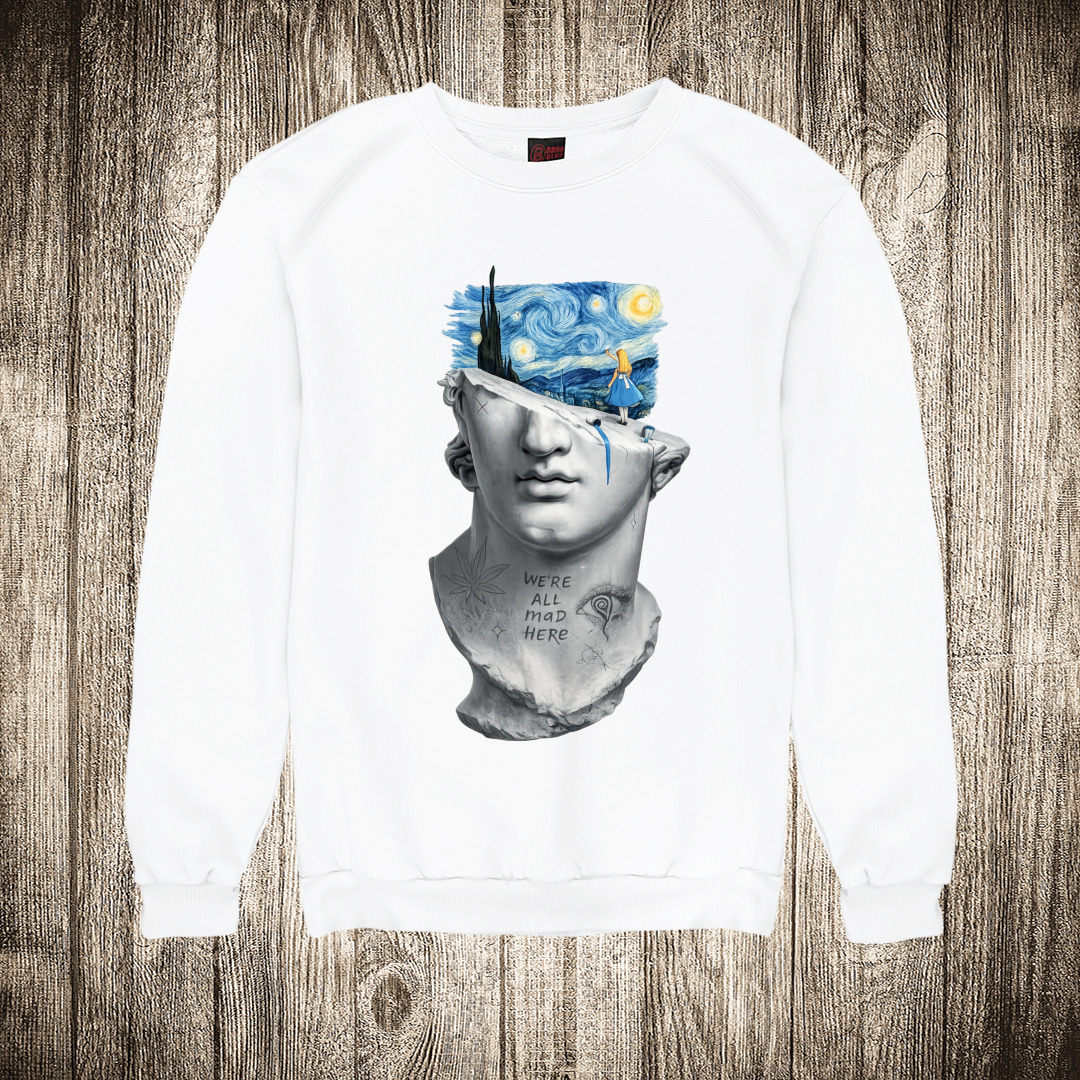 zenska majica boja bela slika alisa u zemlji cuda statua we all mad here