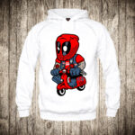 duks bez kapuljace boja bela slika deadpool na skuteru
