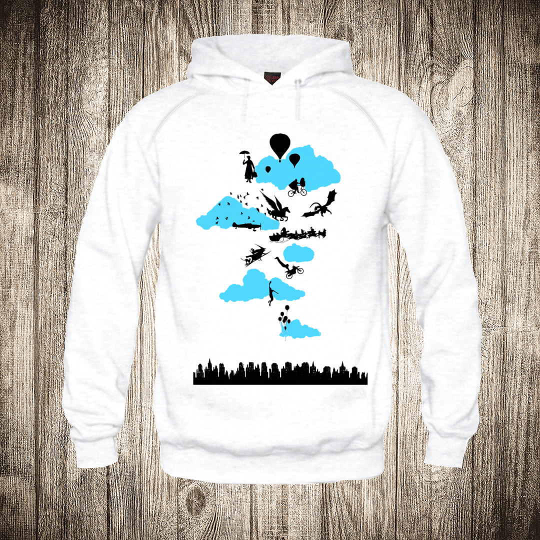 duks sa kapuljacom boja bela slika delovi grada u oblacima
