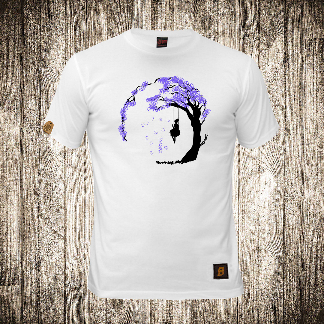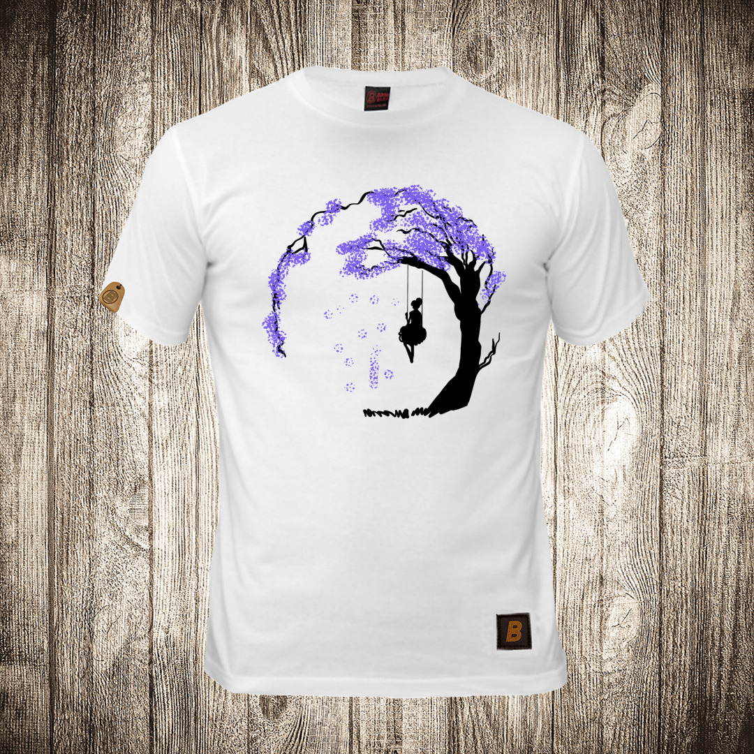 muska majica boja bela slika devojka na ljuljasci sareno drvo