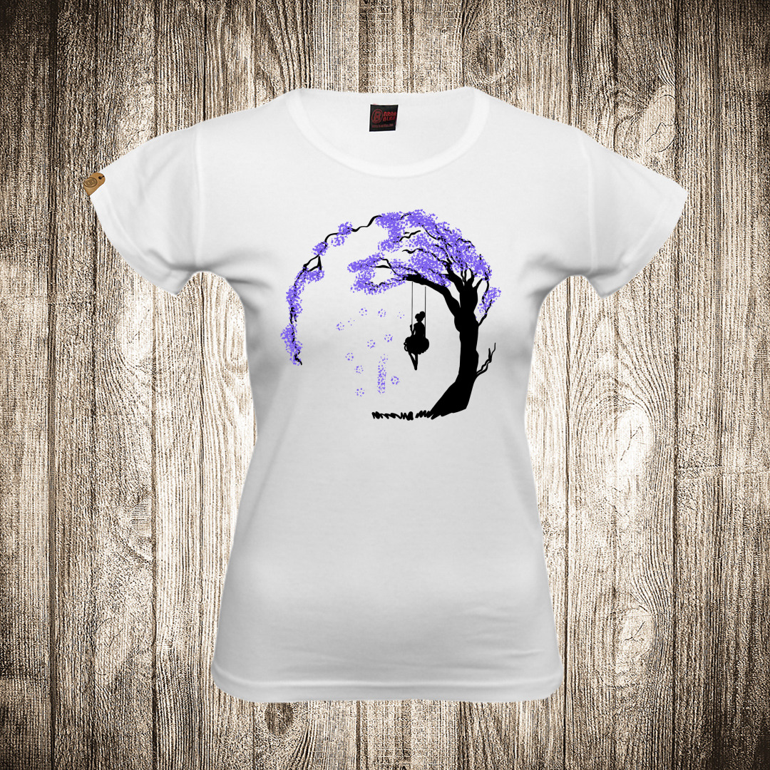 zenska majica boja bela slika devojka na ljuljasci sareno drvo