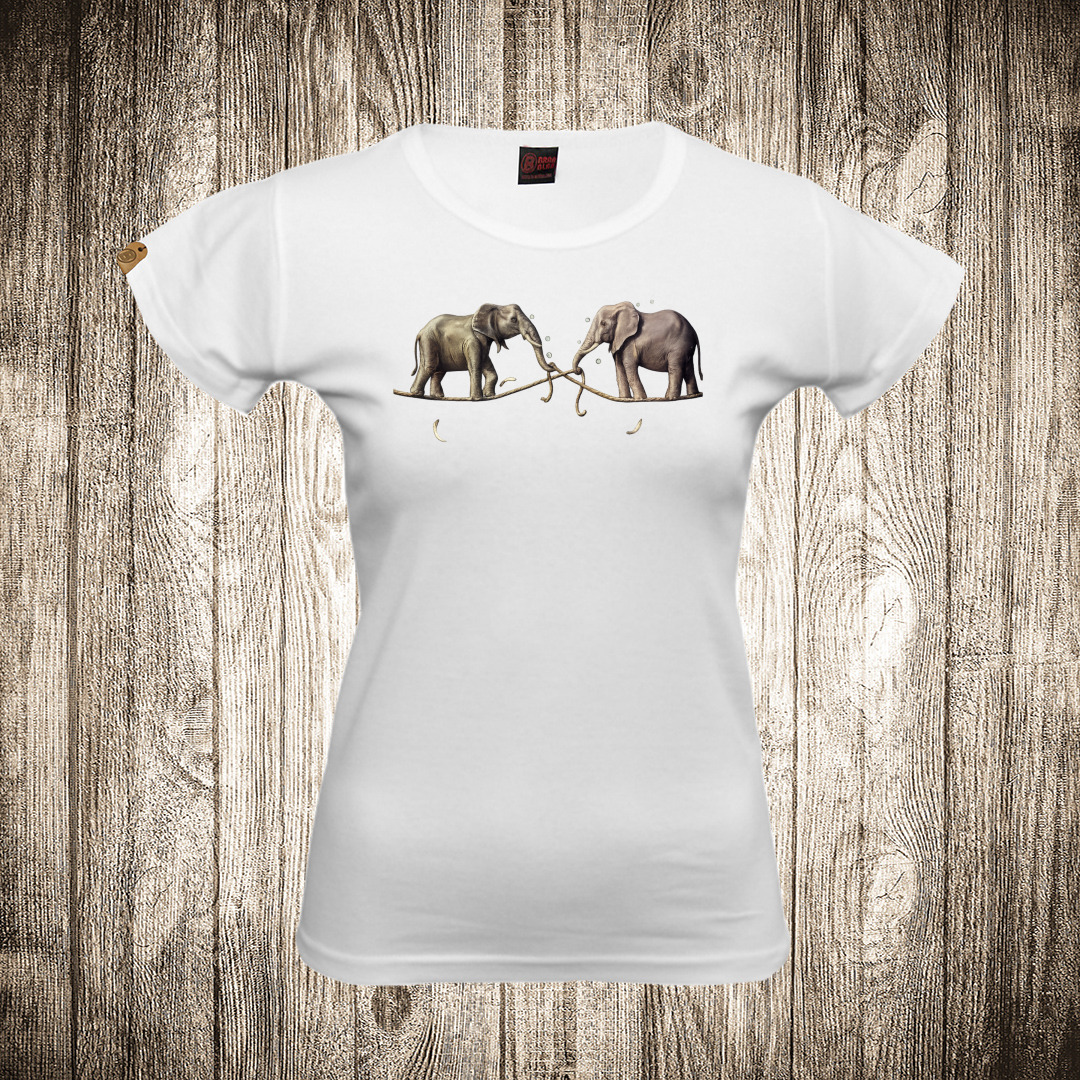zenska majica boja bela slika dva slona na konopcu