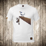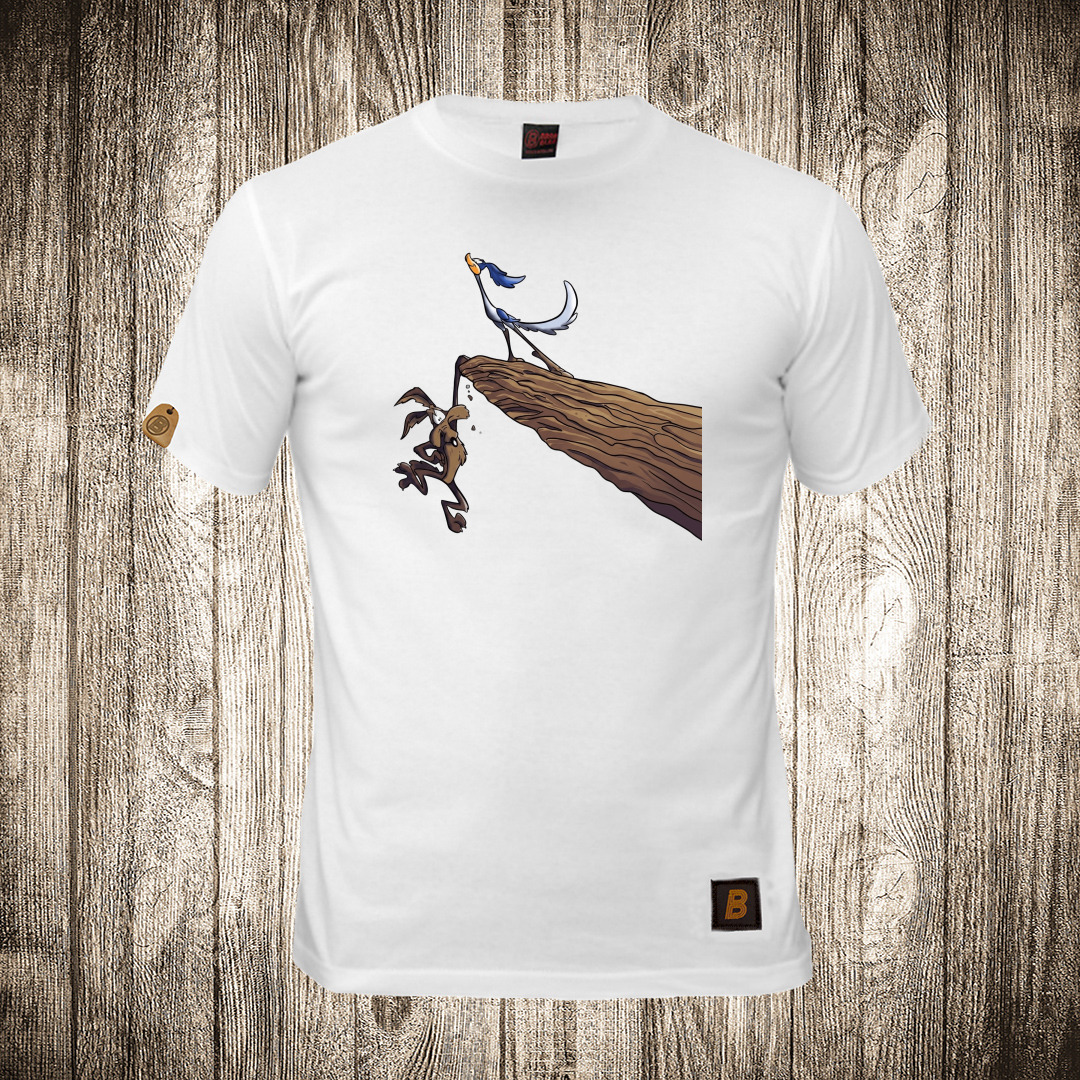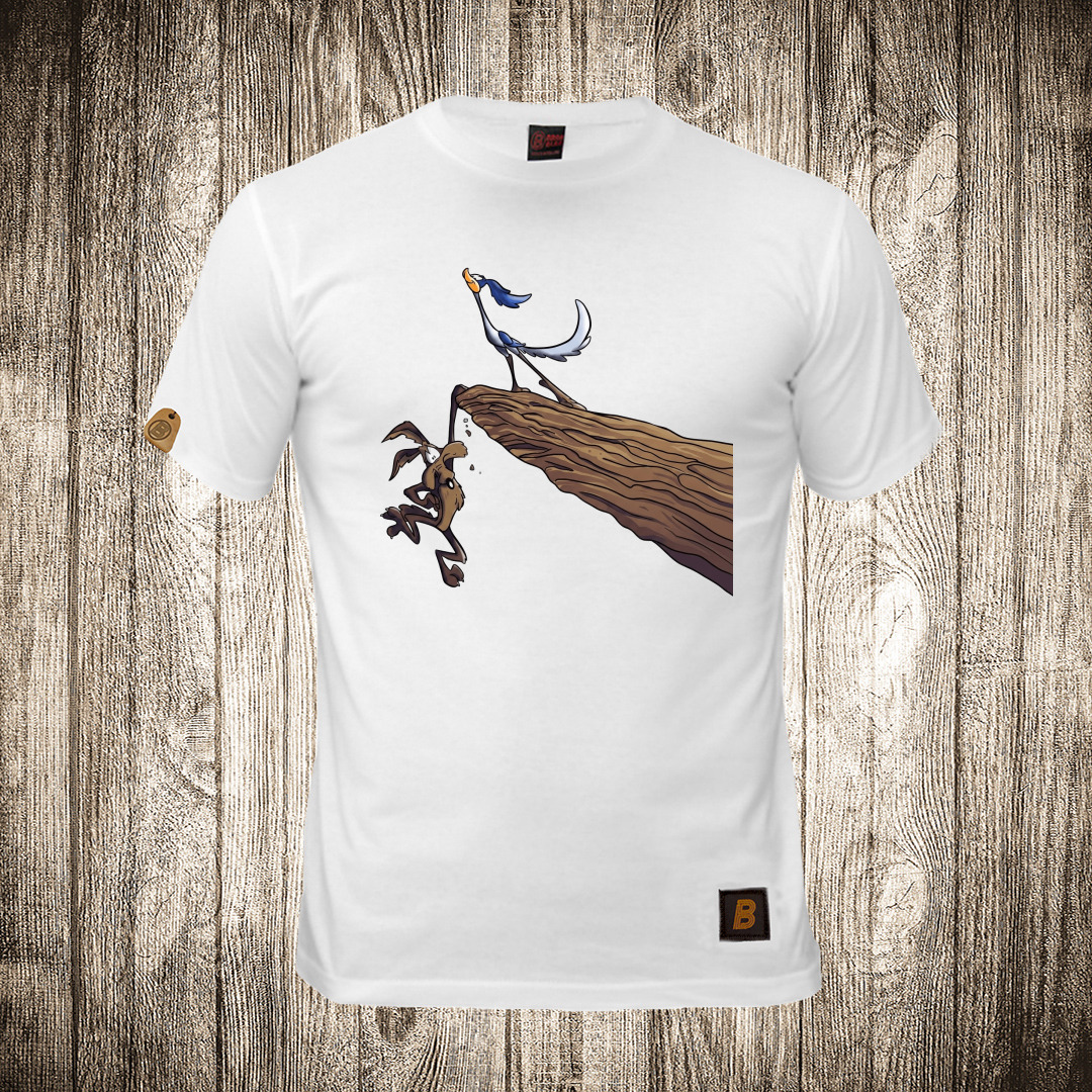 muska majica boja bela slika kojot i ptica trkacica na litici
