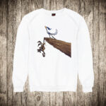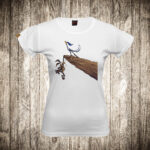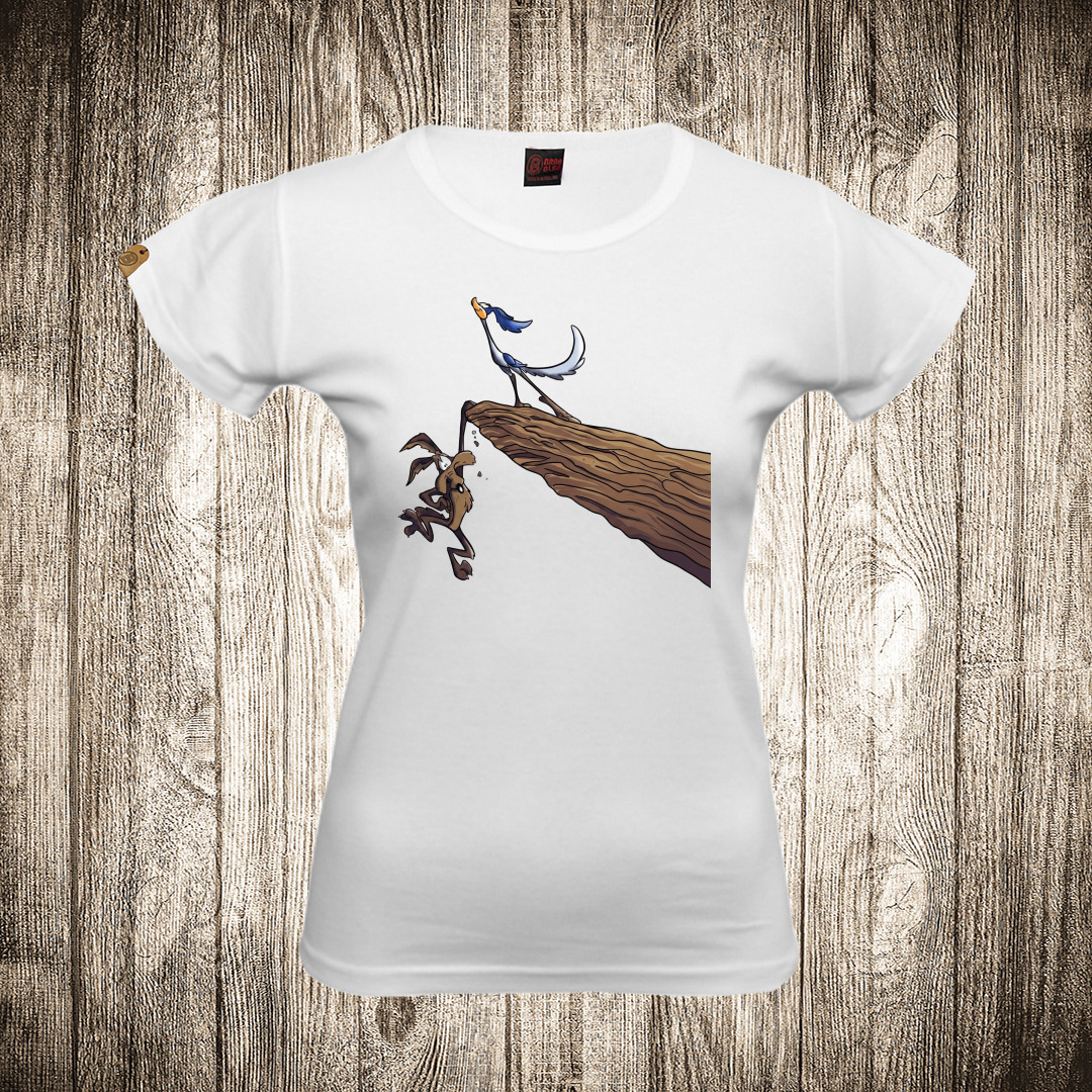 zenska majica boja bela slika kojot i ptica trkacica na litici