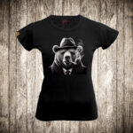 zenska majica boja crna slika medved sa sesirom i tompusom