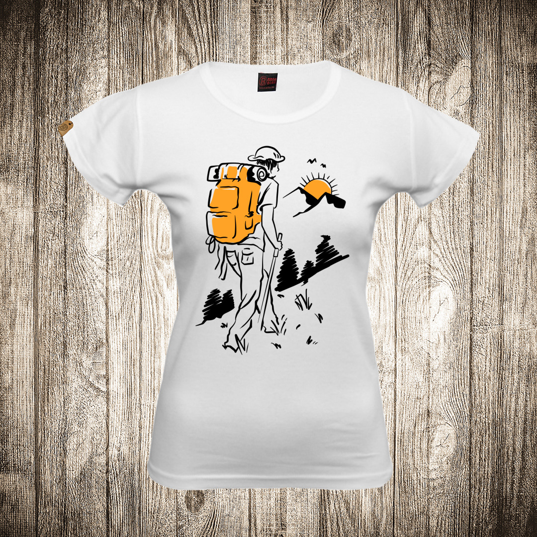 zenska majica boja bela slika put ka planini crtez kampovanje