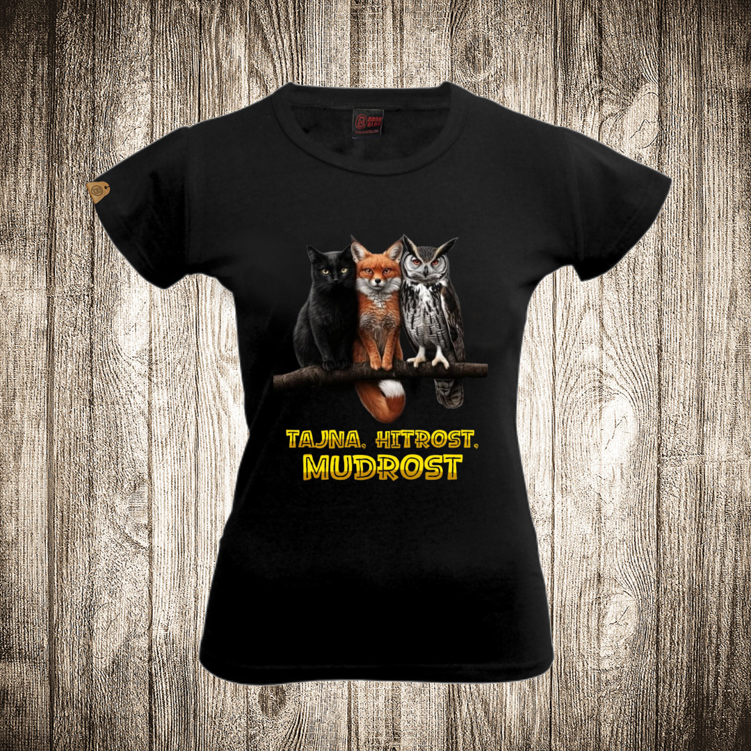 zenska majica boja crna slika tajna hitrost mudrost sova lisica macka